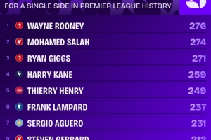 全文摘要:Squawka统计英超单一球队参与进球榜,鲁尼以276球居首。萨拉赫为利物浦贡献274球,位列第二,仅差2球。吉格斯(271球)、凯恩(259球)等名紧随其后。