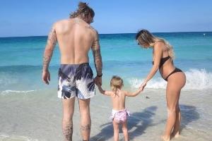 迪莱塔-莱奥塔身穿比基尼,能很明显地能看出她怀孕有一段时间了,卡里乌斯的第二个孩子将在不久后出生。