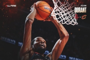 赛后,火箭官方晒图,发布杜兰特本场30+4+7的数据海报。