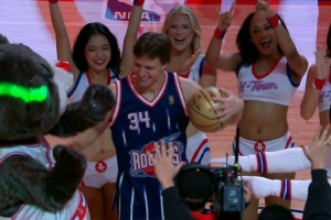 GIF-火箭球迷中场Logo三分打板命中 喜获25000美元大奖
