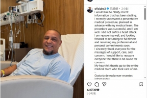 卡洛斯晒出自己在医院的照片,并配文写道:“我想澄清一下最近流传的一些信息,我最近接受了一项预防性医疗程序,这项程序是事先与我的医疗团队商定的。程序很成功,我目前身体状况良好,没有心脏病发作。”