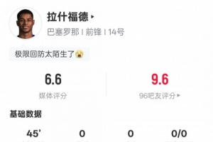 全文摘要:9月22日西甲第5轮,巴萨3-0胜赫塔费。拉什福德替补登场,2次射正全场最多,传球成功率高达93.8%,但未能进球或助攻。