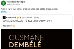 体育资讯09月23日讯 2025金球奖由巴黎球员登贝莱斩获,贝蒂斯转发球员获奖的动态并表示:若有必要小编我会发十遍,他们还没准备好。