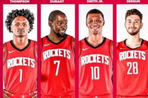根据目前的情况来看,火箭潜在首发阵容中有阿门-汤普森、杜兰特、小贾巴里-史密斯和申京。如果火箭选择打双塔(亚当斯、卡佩拉),或者堆积侧翼球员的话,那么四年级生伊森或新援芬尼-史密斯进入首发,火箭可以排出好几套5人都在2米以上的先发阵容!
