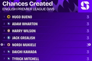 英超第5轮创造机会榜: