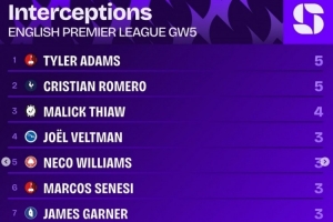 英超第5轮拦截榜: