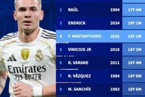 全文摘要:在西甲皇马4-1莱万特的比赛中,18岁1月的马斯坦托诺破门,成为队史西甲第四年轻进球者。他追平了恩德里克的纪录,仅次于传奇球星里维拉(17岁3个月)和劳尔(17岁4个月),展现了皇马青训的卓越实力。