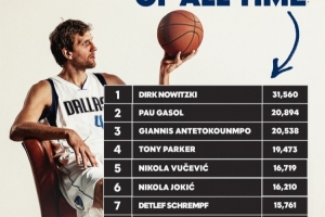 NBA欧洲官方账号晒出欧洲球员得分前十,具体如下: