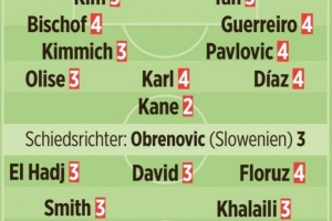 体育资讯1月22日讯 在本轮欧冠,拜仁2-0击败圣吉罗斯。《图片报》也为拜仁球员本场表现做出评分,具体如下(德媒评分1分最高,5分最低):