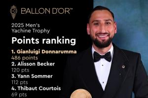 全文摘要:2025年雅辛奖排名公布,意大利门将多纳鲁马以486分断层领先,远超第二名的阿利森(120分)和第三名的索默(112分)。该奖项旨在表彰年度最佳门将,库尔图瓦、布努等知名门将也位列榜单。