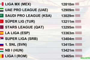 体育资讯2月6日讯 瑞士足球天文台(CIES)统计了30个正在进行的顶级联赛的防守数据,以非门将球员无球状态下每90分钟跑动距离作为依据,列出了防守投入最低的10个联赛。