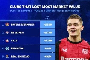 全文摘要:2025年夏窗结束后,德国转会市场公布了全队身价跌幅球队排行榜。勒沃库森以2.54亿欧的跌幅高居榜首,莱比锡(-1.7亿欧)和里尔(-1.24亿欧)分列二、三位。布莱顿(-9400万欧)和皇家社会(-9100万欧)紧随其后。该榜单反映了各队在夏季转会市场的阵容调整与价值变动。