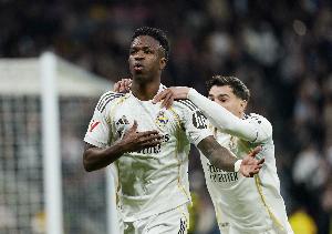 体育资讯2月26日讯 在欧冠淘汰赛附加赛次回合皇马对阵本菲卡的比赛中,维尼修斯破门。