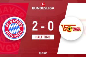 上半场伤停补时1分钟,半场结束,拜仁暂2-0柏林联合。