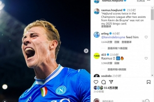 霍伊伦社媒晒出比赛照片,并写道:“霍伊伦在欧冠比赛中梅开二度,还都是德布劳内的助攻——这完全不在我2025年的剧本之中。”