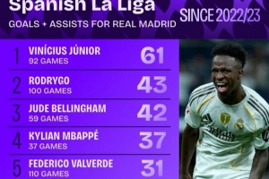 全文摘要:根据Squakwa统计,自22-23赛季以来,维尼修斯以92场61球(进球+助攻)位居皇马球员西甲直接参与进球榜首位。罗德里戈(100场43球)和贝林厄姆(59场42球)分列二、三位,姆巴佩效率极高,37场贡献37球。
