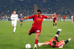 我总是对大家说,我在罗马还做过很多其他美妙的事情,哈哈。当时卡萨诺主罚任意球,我在前点找到一个空档,他的传球不是很好,是个半高球,我当时唯一能做的动作就是用脚后跟射门。我看了这个进球视频无数次,你会发现埃默森也做了和我一样的动作,只是我的运气更好一些,球进了。这不是事先安排的战术,那一刻我只能用脚后跟射门。而在三个月后的训练中,我又一次接卡萨诺的任意球打进了一模一样的进球。