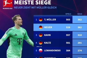 全文摘要:德甲球员胜场排名出炉,诺伊尔以362场追平穆勒,并列榜首。卡恩以310胜位列第三,卡尔茨291胜第四,莱万274胜第五。胡梅尔斯、拉姆、马特乌斯、迈尔和皮萨罗分列其后。