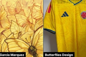 哥伦比亚世界杯主场球衣的独特之处在于其蝴蝶图案,以此向哥伦比亚作家马尔克斯致敬,象征着希望、变革和爱的黄色蝴蝶在他的作品中频繁出现。