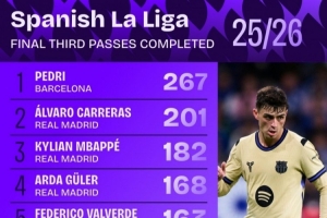 全文摘要:Squawka统计了西甲本赛季进攻三区传球榜。巴萨球员佩德里以267次传球高居榜首。皇马有5名球员跻身前十,卡雷拉斯、姆巴佩等位列其中。巴萨的埃里克-加西亚和德容也进入榜单。