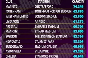 体育资讯10月17日讯 《太阳报》对比上个赛季和本赛季的英超手册,发现有五支英超俱乐部的球场容量较上赛季有所变化。