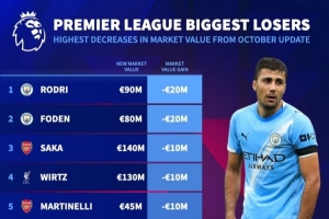 英超身价跌幅榜: