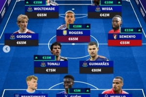 中场:戈登(纽卡,6500万欧元)、托纳利(纽卡,7500万欧元)、摩根-罗杰斯(维拉,6500万欧元)、吉马良斯(纽卡,8000万欧元)、塞梅尼奥(伯恩茅斯,5500万欧元)