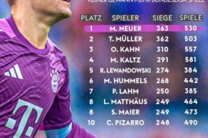 全文摘要:在10月19日的德甲国家德比中,拜仁2-1战胜多特。门将诺伊尔迎来第530场德甲比赛,取得第363场胜利,超越穆勒成为德甲历史胜场数最多的球员。