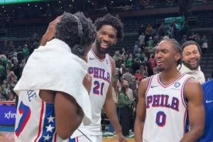 GIF-埃奇库姆接受采访,恩比德马克西等人泼水庆祝