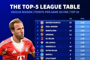 全文摘要:《转会市场》统计显示,五大联赛场均拿分榜上拜仁慕尼黑以3.00分高居榜首,皇马、巴萨、阿森纳分列二至四位。德甲球队表现强势,英超豪门曼城仅列第13,利物浦跌至第19位,整体竞争格局呈现多队并存的态势。