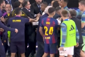体育资讯10月27日讯 据西媒eldesmarque报道,国家德比比赛临近结束时,巴萨中场佩德里吃到第二张黄牌被罚下场,这一事件成为了“导火索”,直接引发了双方替补席人员的“大规模混战”。场面一度失控,以至于安保不得不迅速介入,强行将两队替补席分隔开。