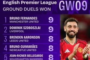 体育资讯10月28日讯 英超联赛第9轮已经完赛,数据机构squawka统计了本轮地面对抗成功次数,曼联队长B费和利物浦中场索博斯洛伊并列居首。