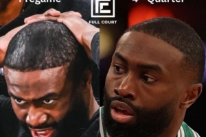 据此前报道,绿军球星杰伦-布朗遭遇了“发际线危机”,本赛季至今已经多次将自己的发际线粉蹭到对手球衣上。