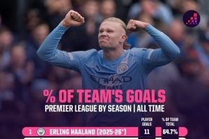 体育资讯10月31日讯 Opta统计了球员单赛季英超进球在球队的占比,并列出榜单,本赛季哈兰德占比64.7%最高。