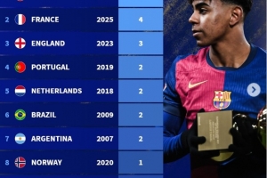 全文摘要:巴黎圣日耳曼小将杜埃赢得2025年金童奖。德转统计显示,西班牙以5次获奖次数位居各国之首,法国以4次次之,英格兰3次。葡萄牙、荷兰、巴西、阿根廷均获两次,挪威、德国、意大利各有一次。