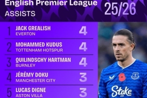 全文摘要:英超联赛11轮战罢,助攻榜数据更新。格拉利什、库杜斯与哈特曼以4次助攻并列榜首,多库等7名球员以3次助攻紧随其后。曼联的B费与切尔西的佩德罗等知名球员均位列其中。