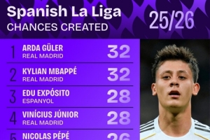 本赛季西甲创造机会次数: