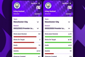 全文摘要:Squawka对比了哈兰德上赛季与本赛季的英超数据。本赛季,他的射门、射正和进球效率(每90分钟1.4球)均有所提升,争顶成功率大增,但助攻、创造机会等数据略有下降。总体表现依然高效且稳定。