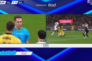 比赛第86分钟,米兰前锋恩昆库在禁区内被博洛尼亚后卫卢库米推倒,恩昆库起身后护球时和另一名博洛尼亚后卫弗鲁勒对抗时再次倒地。主裁判先是判罚点球,随后VAR介入,主裁判观看视频回放后取消了点球,米兰主帅阿莱格里因不满判罚还吃到红牌。