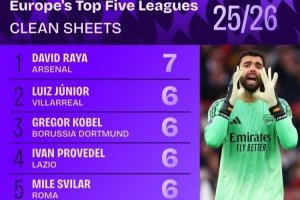 全文摘要:五大联赛门将零封榜出炉,阿森纳门将拉亚以7场零封居首。比利亚雷亚尔的儒尼奥尔、多特蒙德的科贝尔等6门将并列第二,均完成6次零封。皇马的库尔图瓦和巴黎的舍瓦利耶也位列其中。