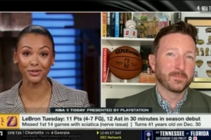 体育资讯11月22日讯 今天的《NBA Today》节目,主持人Malika Andrews连线了自己的老公、湖人随队记者Dave McMenamin,聊到了詹姆斯复出后的安排。