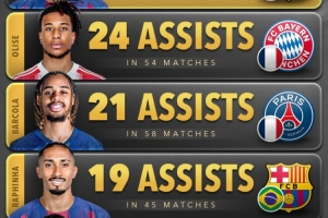 2025年五大联赛球员助攻排名(俱乐部+国家队):
