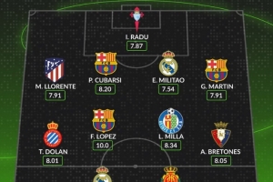 体育资讯9月16日讯 本轮西甲战罢,数据网站Whoscored也评出本轮西甲最佳阵,具体如下: