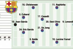 全文摘要:《阿斯报》预测巴萨将主场迎战阿拉维斯的首发阵容。预计霍安·加西亚镇守球门,后防线由克里斯滕森、库巴西、埃里克·加西亚和巴尔德组成。中场方面,卡萨多、德容和奥尔莫将联袂出击。锋线则由拉菲尼亚、莱万和年轻天才亚马尔组成进攻线。