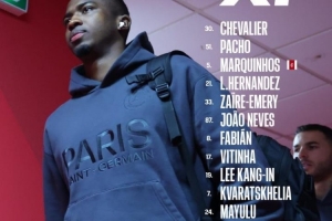 巴黎首发:舍瓦利耶;帕乔、马尔基尼奥斯、卢卡斯·埃尔南德斯、埃梅里、若昂·内维斯、法比安、维蒂尼亚、李刚仁、克瓦拉茨赫利亚、马尤卢