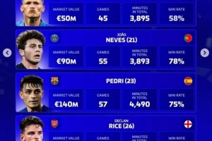 内维斯(巴黎,21岁,葡萄牙):身价9000万欧,55场,3893分钟,胜率78%