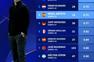 全文摘要:阿尔特塔执教阿森纳25场欧冠,场均仅丢0.72球,防守效率位列历史第三。这一数据仅次于卡佩罗(场均0.68球)和里杰卡尔德(场均0.70球),展现了其出色的战术防守能力,彰显了阿森纳在后防端的稳固与进步。