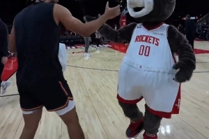 GIF-狄龙赛前和火箭主场的吉祥物打闹