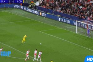 比赛第54分钟,博德闪耀获得一个点球,但霍格主罚的点球被布拉格门将斯坦尼克神勇扑出,错失扳平比分的良机!