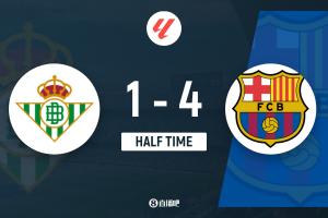 半场-巴萨4-1贝蒂斯 费兰半场帽子戏法巴德吉处子球 安东尼破门